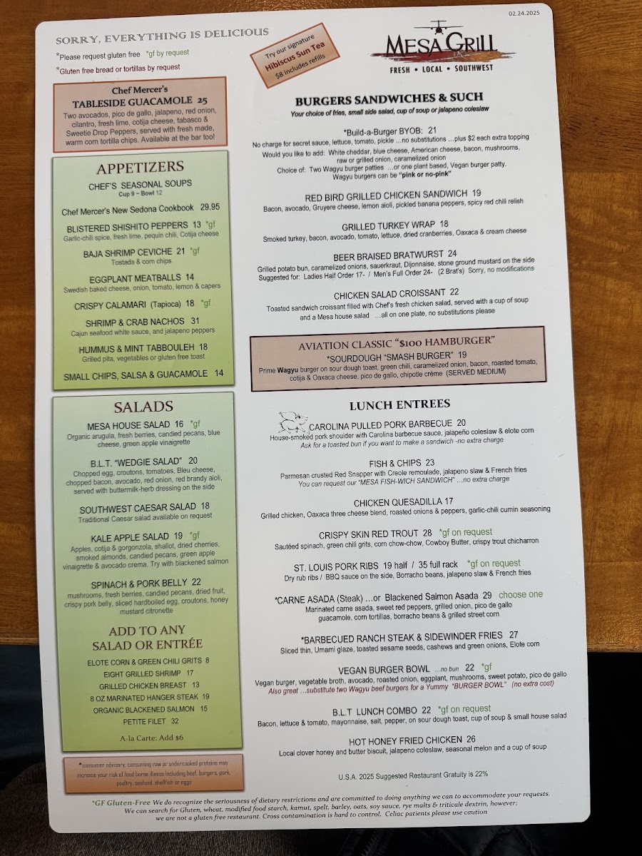 “ Mesa Grill is on the Sedona Airport, most Airport restaurants are greasy spoons and good for only a breakfast fly-In, but the Mesa Grill is a great place to fly to for that hundred dollar hamburger, which none of us had. Guacamole prepared at the table side was awesome, as was all our lunch entries. We always take people hear from out of town and will definitely continue to do so, love it. ”